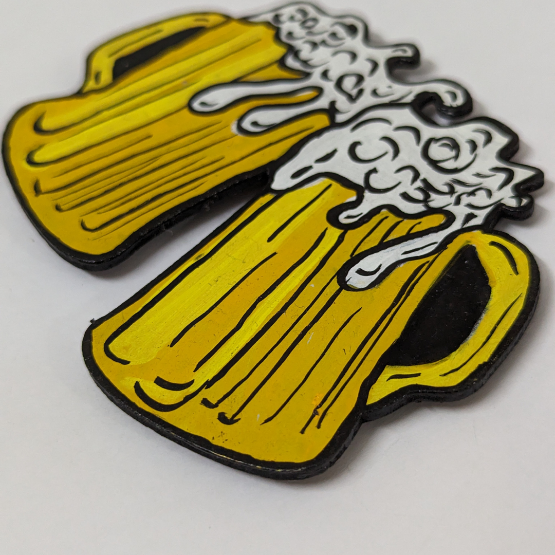 Fun hand-painted beer mugs fridge magnet adds a festive touch to your kitchen. Perfect for beer enthusiasts and adding a cheerful vibe.
