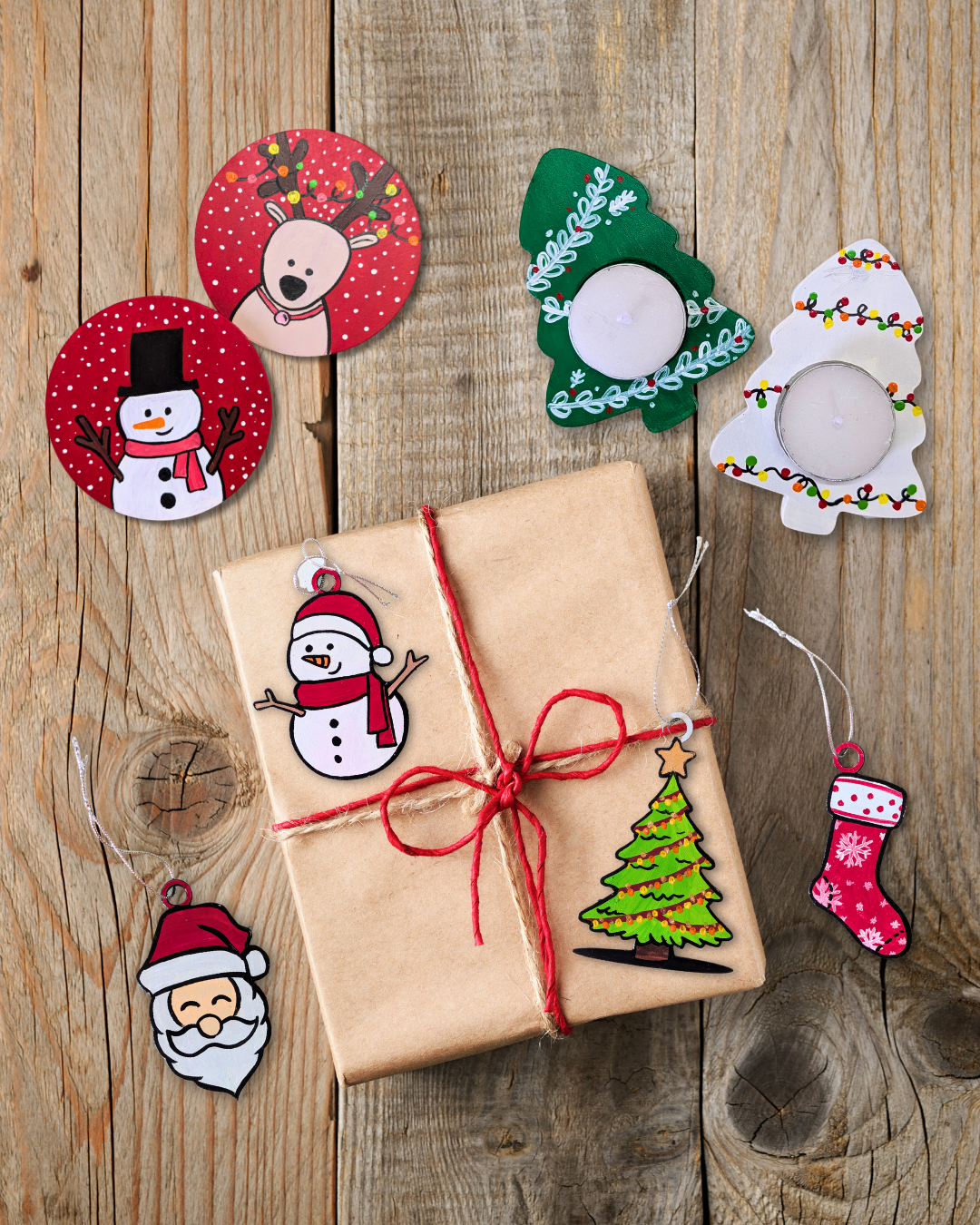 - 🎅 Christmas Ornaments (Set of 4): Delightful designs featuring a snowman, stocking, Santa, and Christmas tree.