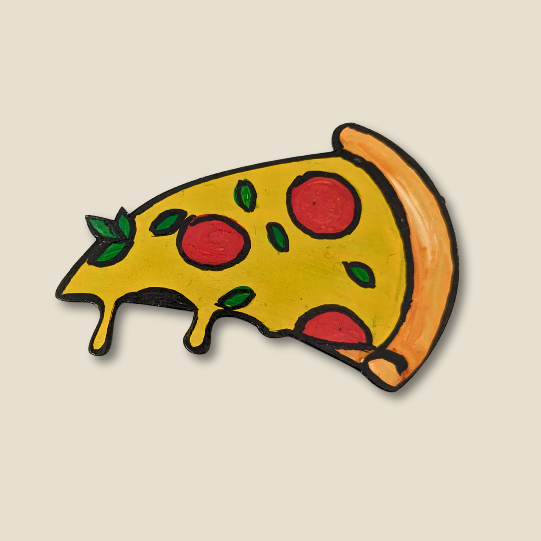 Deliciously cute hand-painted pizza slice fridge magnet adds a fun and cheesy touch to your kitchen. Perfect for pizza lovers.